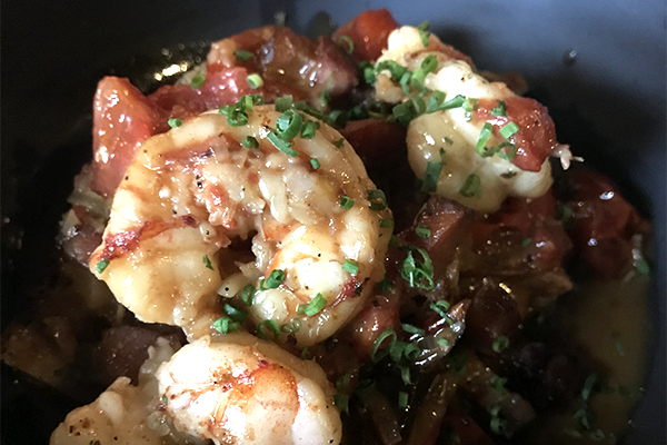 GA Royal Red Shrimp Toast with tomatoes and bacon in a spicy Creole sauce