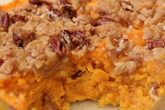 Now, in addition to being just downright delicious, I love to make this Sweet Potato Casserole for Thanksgiving because I can easily multi-task and roast the sweet potatoes while all of our other Thanksgiving favorites are cooking. Because sweet potatoes are very forgiving and can be baked at temperatures a little lower or higher than the recommended 350 degrees F called for in this recipe, I just throw the sweet potatoes in the oven alongside the cornbread for the dressing or the turkey that needs to roast for a few hours. It is important to buy sweet potatoes that are similar in size (so they all finish cooking at the same time) and you’ll know that they’re done when you can easily insert a sharp knife or fork into the center of the potato. After that, simply assemble the remaining ingredients and throw the casserole into the oven for 30 minutes – seriously, that’s all there is to it!