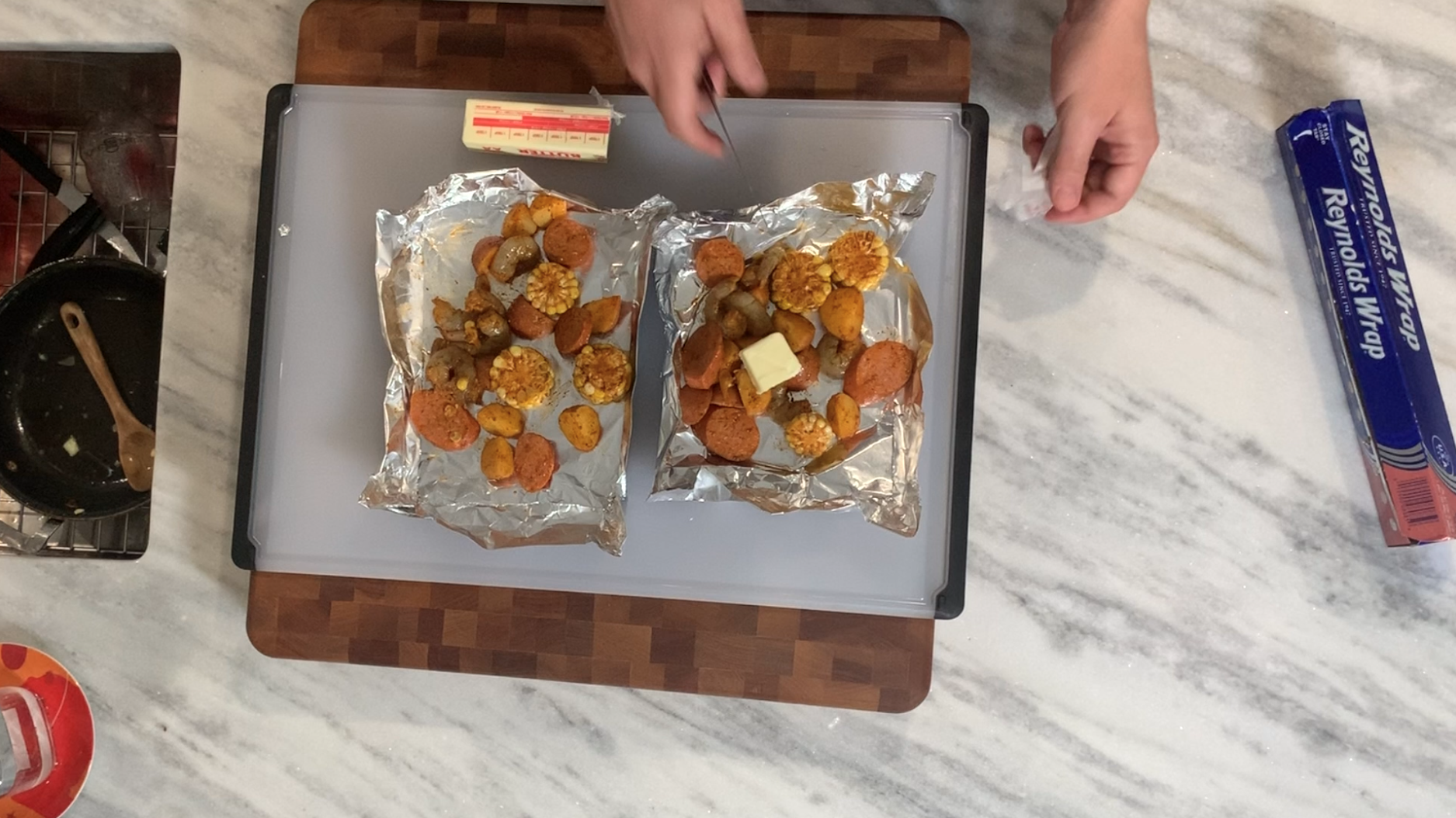 Our Director of Digital Carbs is missing traveling to the low country this time of year. So, to bring the low country home to him and make it a dinner for two, he’s been creating super simple Low Country Boil packets in aluminum foil! Check out how he puts his together and try it at home!