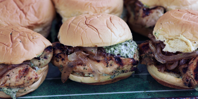 Garlicky Chicken Sandwich With Basil Mayo And Caramelized Onions