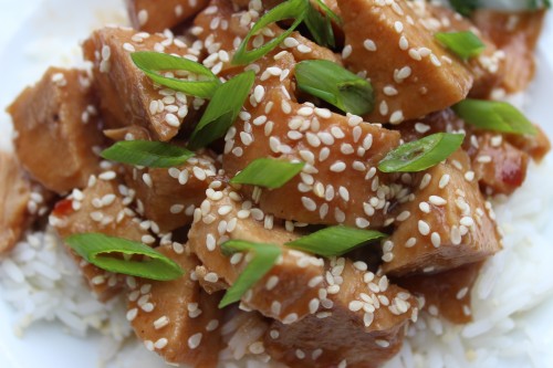 Sprinkle with sesame seeds and chopped scallions (if desired) and serve over rice or noodles.