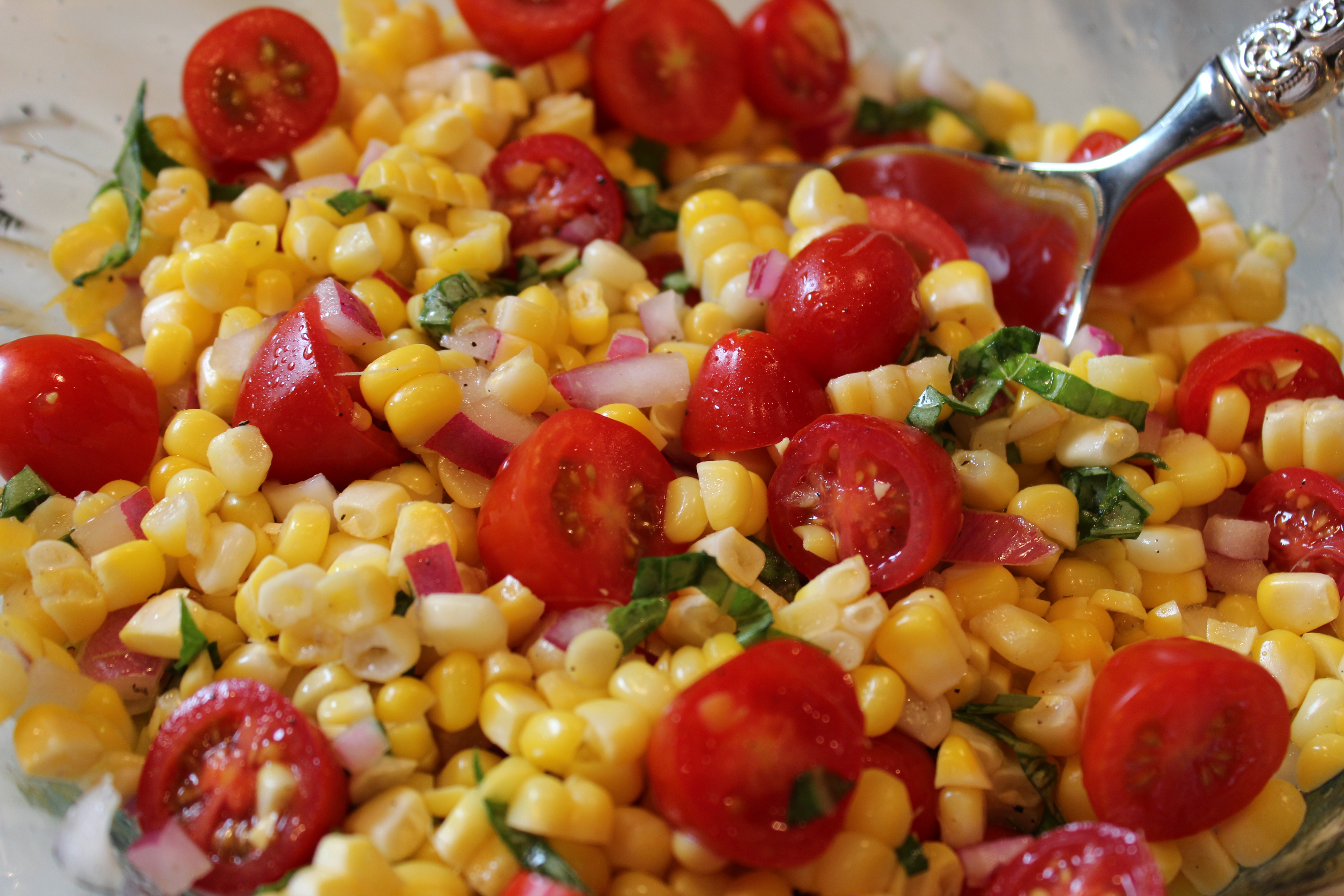 Consisting of sweet corn, juicy grape tomatoes, crisp red onion, chopped basil, and a light vinaigrette, this Summer Corn Salad is sure to be a huge hit with guests at your next gathering (even with the little ones – while I was taking the photo for this blog entry, my sixteen month old sat in his highchair and ate two HUGE servings of this salad!).